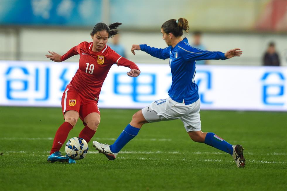12月3日,中国队球员谭茹殷(左)在比赛中进攻。 当日,中国足协中国之队国际足球赛中国女足对阵意大利女足的比赛在贵阳奥体中心举行。新华社记者刘续摄