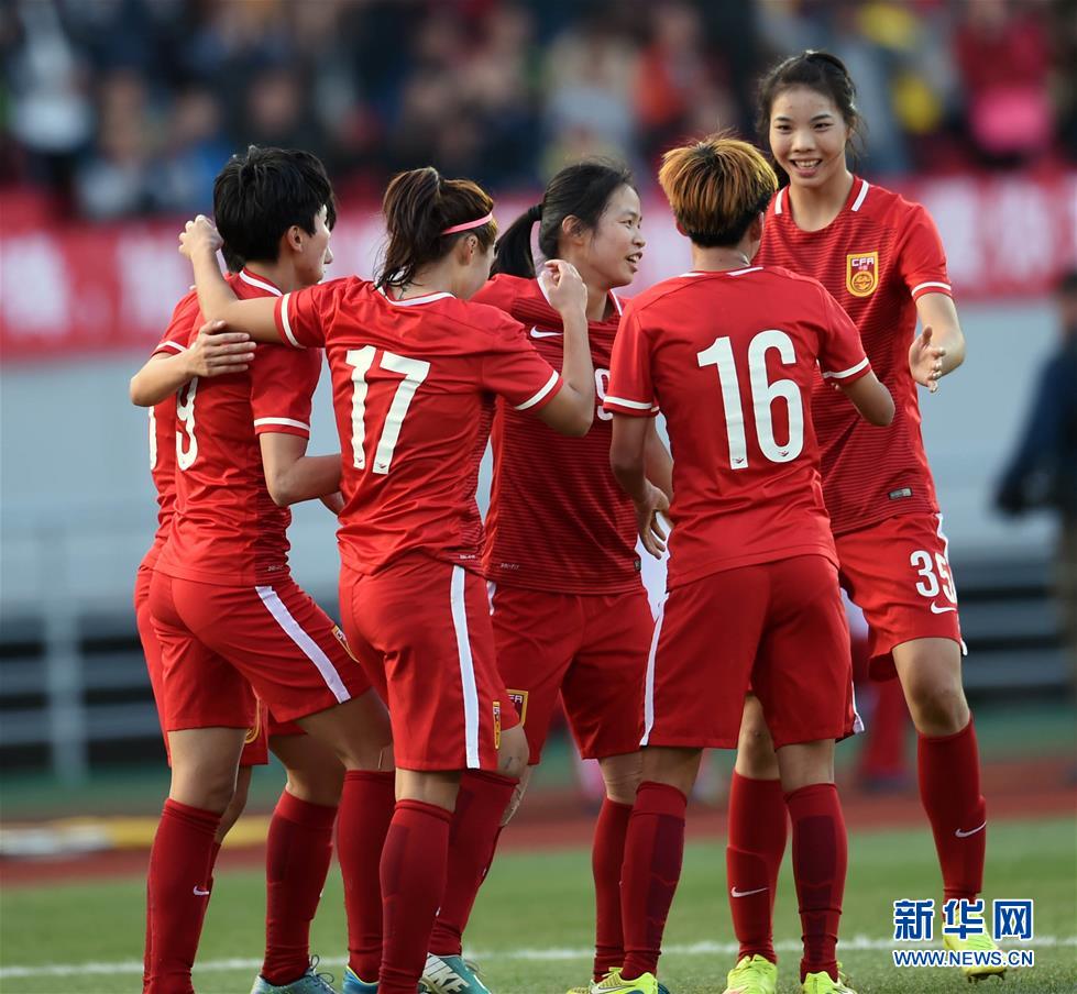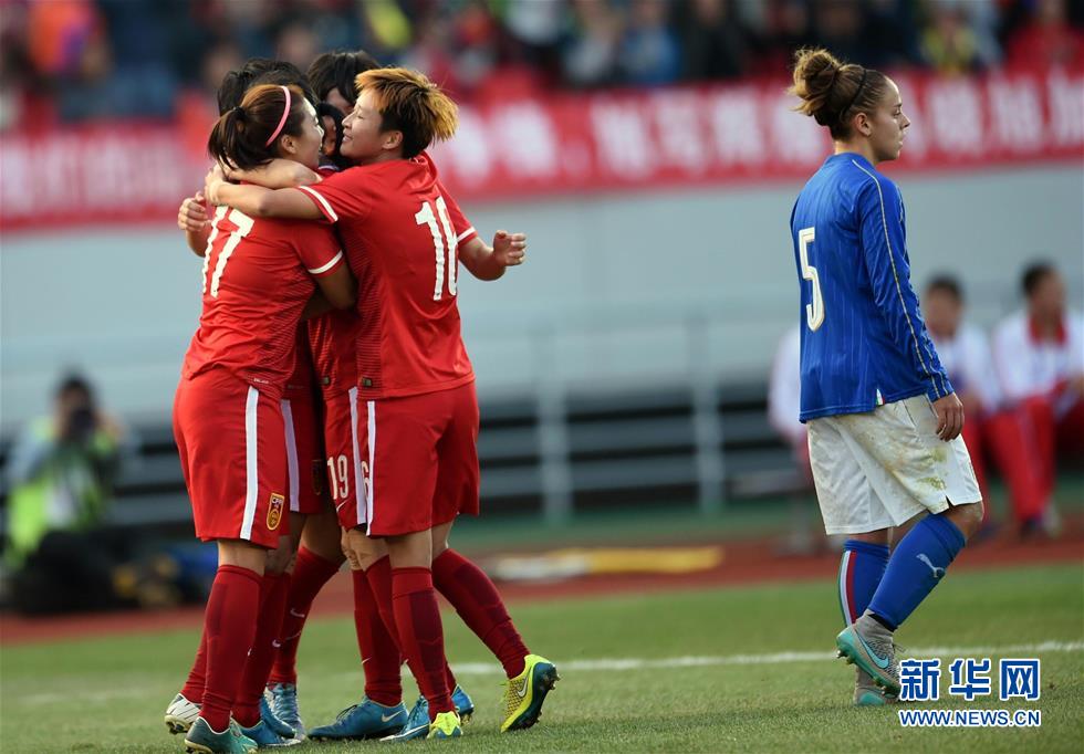 12月6日,中国队球员在比赛中庆祝进球。当日,在云南曲靖市文体公园体育场举行的中国足协中国之队国际足球赛中,中国女足以2比0战胜意大利女足。 新华社记者杨宗友摄