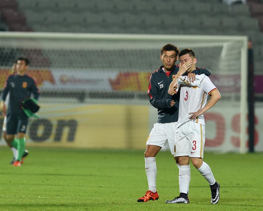 1月15日,中国国奥队球员糜昊伦(右)在比赛后离场。当日,在卡塔尔多哈举行的U23亚洲足球锦标赛暨里约奥运会亚洲区预选赛中,中国国奥队以1比3不敌叙利亚国奥队。 新华社记者贺灿铃摄