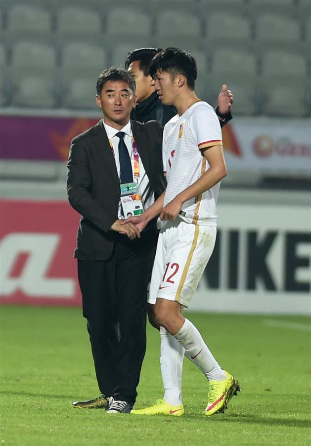1月15日,中国国奥队主教练傅博(左)在比赛后安慰球员。当日,在卡塔尔多哈举行的U23亚洲足球锦标赛暨里约奥运会亚洲区预选赛中,中国国奥队以1比3不敌叙利亚国奥队。 新华社记者贺灿铃摄