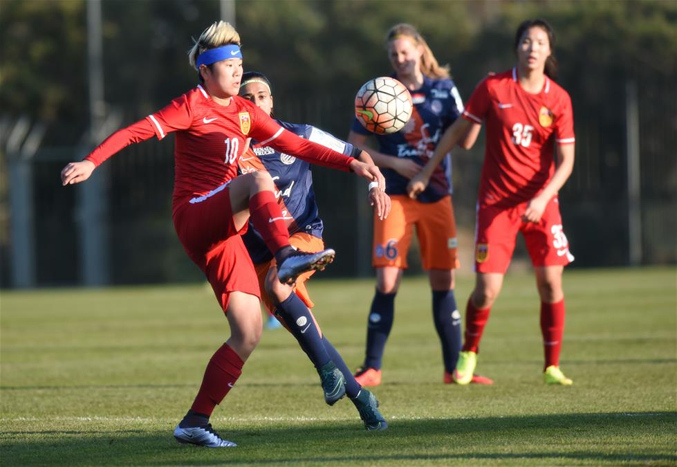2月17日,中国女足队员王霜(左)在比赛中进攻。当日,正在法国集训的中国女子足球队在法国南部城市蒙彼利埃与法甲女足劲旅蒙彼利埃队进行比赛,最终中国女足以4比0战胜对手。新华社发(蒂姆·亚历山大摄)