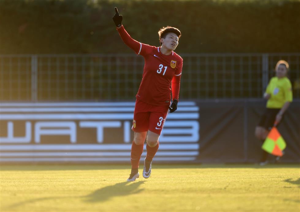 2月17日,中国女足队员马晓旭庆祝进球。当日,正在法国集训的中国女子足球队在法国南部城市蒙彼利埃与法甲女足劲旅蒙彼利埃队进行比赛,最终中国女足以4比0战胜对手。新华社发(蒂姆·亚历山大摄)