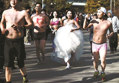 假发彩绘、迷你草裙摇曳、婚纱混搭运动鞋……一年一度的“光猪跑”2月28日早上在北京奥林匹克森林公园火热开跑,这项持续了5年的民间运动已演变为京城跑步圈的年度造型盛会,参加“光猪跑”的数百位跑友身着泳衣、短裤,不畏零度寒冷,即便是一条遮羞布也被他们演绎成一场欢乐的奇装异服秀。