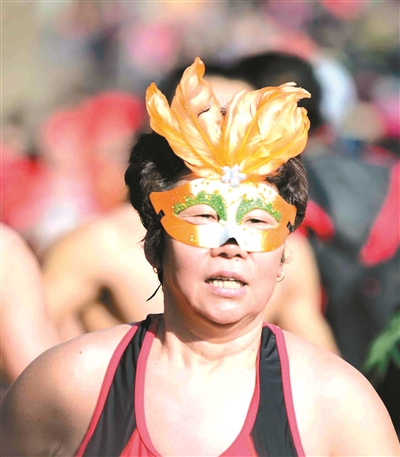 上午9时,气温为0摄氏度,初春严寒并没有减少“光猪跑”跑者的兴致,不少人穿着外套在奥林匹克森林公园南门附近做起了热身运动。半小时后,大家开始脱掉外衣外裤,男士们脱得只剩内裤,一些女士则穿着短裤和运动背心,今年还照老规矩,3.5公里的环园跑。光着脚、身着草裙的大叔大妈率先登场,吸引了晨练人群的目光,也吸引了不少围观和跟拍者。一位中年男子上半身写着“与小鲜肉差30斤”引来大家的一阵欢笑。熙熙攘攘的人群里,一位打扮成“运动辣妈”的女跑友成为众人焦点,1岁左右的孩子背在身前,身着运动背心的她健步如飞,身后不远处,另一个穿着白色婚纱和运动鞋的短发姑娘也引人注目。奇装异服的跑友们经过之处,一阵相机快门声迅速响起来,跑步的人朝大家挥挥手,有说有笑。上百位的跑步者有戴着五颜六色小丑假发的,也有戴着电影《星球大战》面具的运动达人。跑步者李先生说:“这是第四次参加‘光猪跑’,平时有跑步的习惯,参加光猪跑前也会费心思想想当天怎么打扮。”