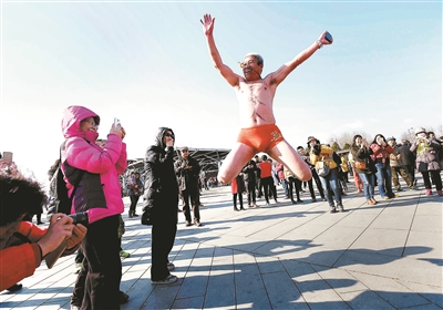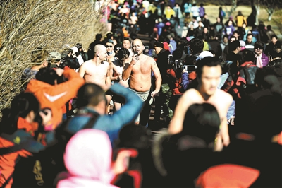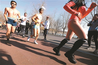 之所以称之为“光猪跑”,是因为参与者们在气温较低的室外,只穿内衣内裤,尽可能地裸露身体。据悉, “光猪跑”这项运动起源于欧美,2010年后逐渐在国内风靡,跑步时最多只穿两件内衣,表达一种宣泄的生活态度。由北京跑友圈的“北窗”、“党旗”等几位比较有号召力的网友自发举办的奥森“光猪跑”,今年已是第五个年头了。摄影/本报记者 崔峻