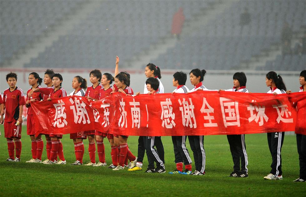 图为2011年9月11日,中国女足队员在比赛后打出横幅感谢球迷。当日,在山东济南进行的2012年伦敦奥运会女足亚洲区预选赛中,中国队以0比1不敌日本队,以5战1胜2平2负积5分的成绩,失去伦敦奥运会参赛权。新华社发