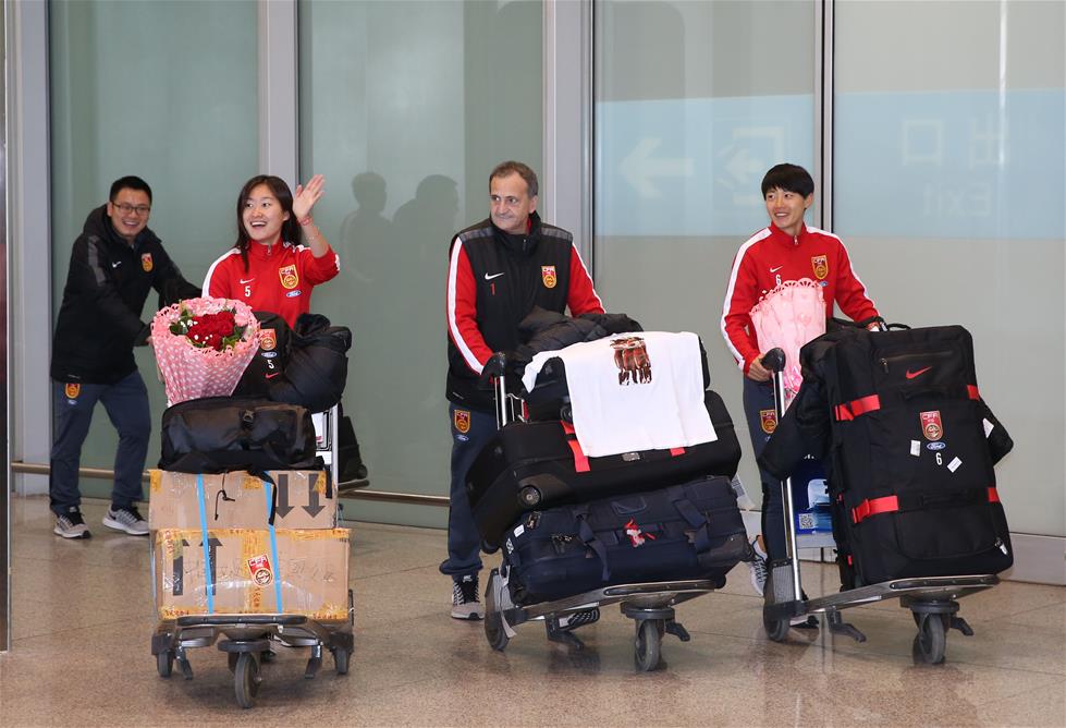 3月10日,中国女足球员吴海燕(左二)与主教练布鲁诺(右二)等走出机场。当日,参加2016年里约奥运会女足亚洲区预选赛的中国女足从日本归来,抵达北京首都国际机场。中国女足在本次预选赛中以3胜2平积11分排名第二位,时隔八年重返奥运会。新华社记者孟永民摄