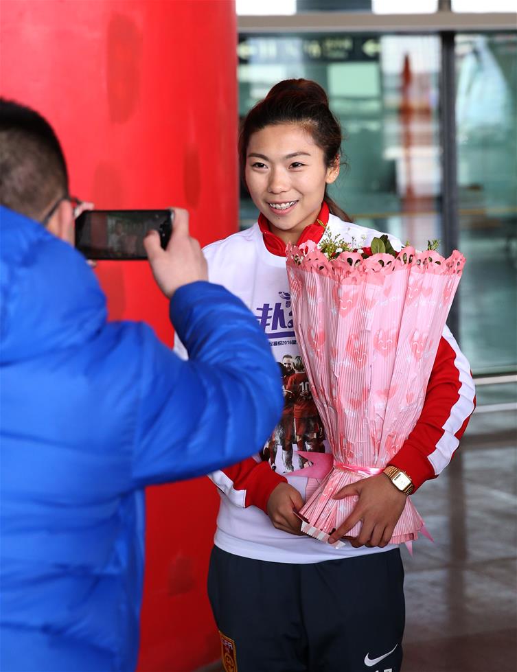 3月10日,中国女足球员古雅沙(右)在机场留影。当日,参加2016年里约奥运会女足亚洲区预选赛的中国女足从日本归来,抵达北京首都国际机场。中国女足在本次预选赛中以3胜2平积11分排名第二位,时隔八年重返奥运会。新华社记者孟永民摄