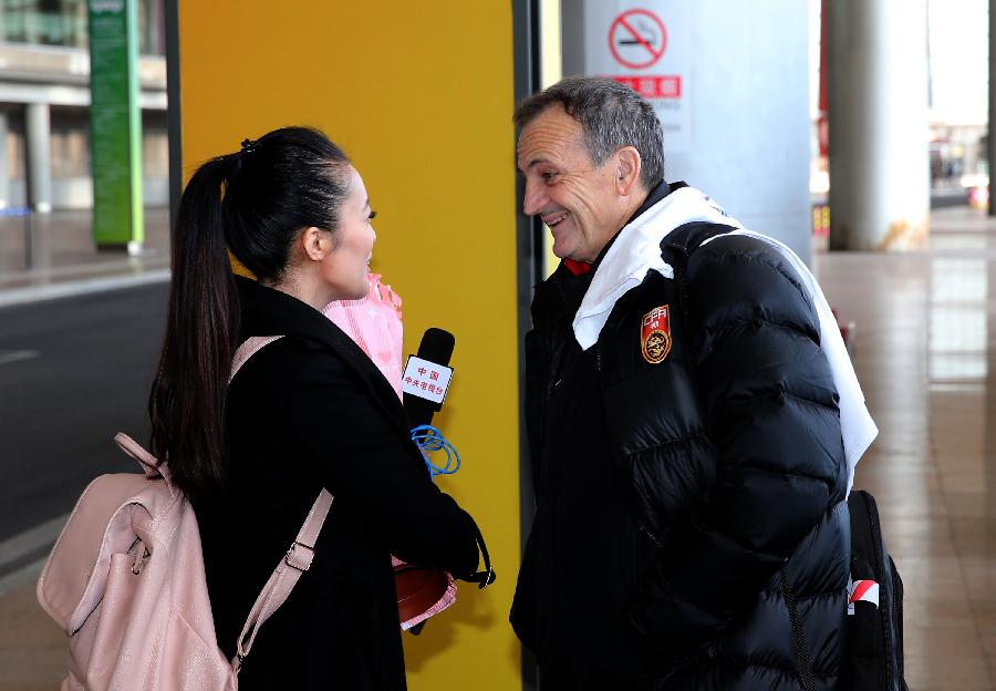 3月10日,中国女足主教练布鲁诺在机场与记者交流。当日,参加2016年里约奥运会女足亚洲区预选赛的中国女足从日本归来,抵达北京首都国际机场。中国女足在本次预选赛中以3胜2平积11分排名第二位,时隔八年重返奥运会。新华社记者孟永民摄