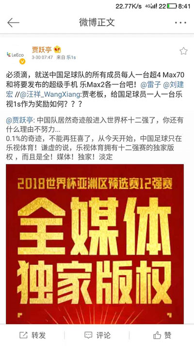 当国足确定百分之百出线之时,不仅是乐视体育的新闻编辑同学一片欢腾,乐视大生态的所有同学也坚持到凌晨后半夜,他们或许是为国足踢出了一场大国风范的足球倍感而悲观鼓舞,或许是为了各条业务线积极与“国足”生态化反而进行着收尾工作……不管是来自智能硬件还是视频运营、不管是来自云服务还是各种“超级产品”的同学,在这惊心动魄的8个小时,将生态协同、打破边界的乐视生态精神发挥到极致……而更令人窒息的是,一项一向大方敞亮的乐视创始人贾跃亭通过微博积极响应乐迷和网友的呼声,将送给中国足球队所有成员每人一台超4 Max70和将要发布的超级手机乐 Max2各一台,这位深爱中国体育的互联网大佬果然大手笔……