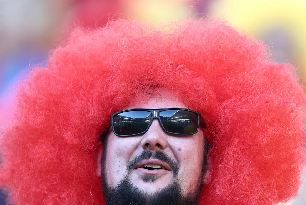 6月21日,一名西班牙队球迷在看台上等待比赛开始。当日,在法国波尔多进行的2016年欧洲足球锦标赛小组赛D组比赛中,西班牙队对阵克罗地亚队。 新华社记者张帆摄