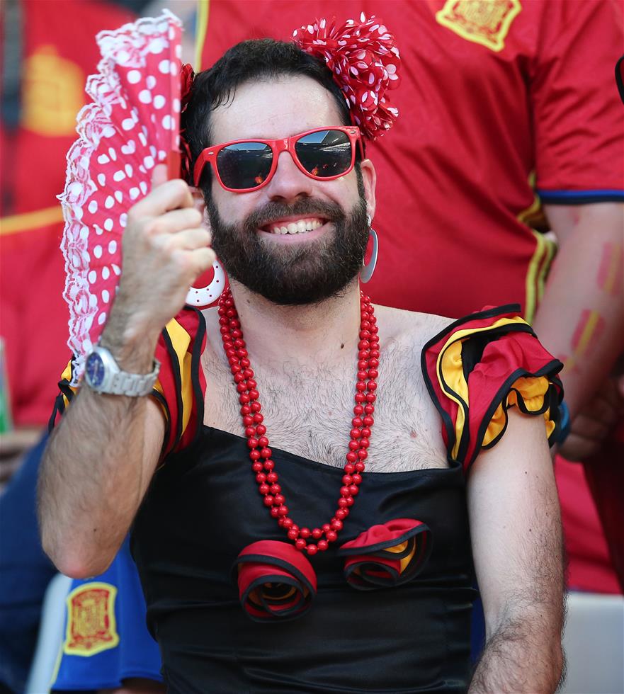 6月21日,一名西班牙队球迷在看台上等待比赛开始。当日,在法国波尔多进行的2016年欧洲足球锦标赛小组赛D组比赛中,西班牙队对阵克罗地亚队。 新华社记者张帆摄