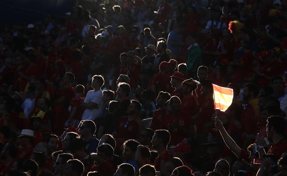 6月21日,球迷在看台上等待比赛开始。当日,在法国波尔多进行的2016年欧洲足球锦标赛小组赛D组比赛中,西班牙队对阵克罗地亚队。 新华社记者张帆摄