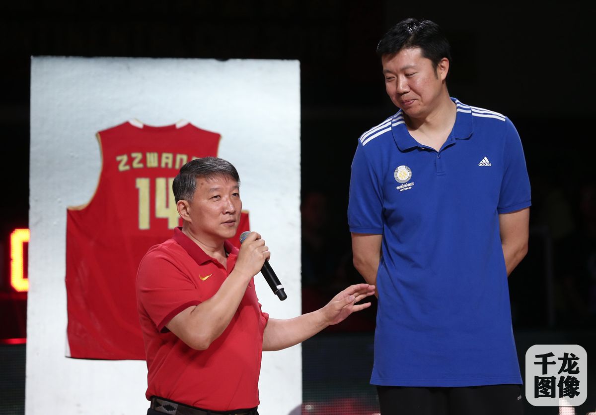 7月5日,中国男篮标志人物王治郅的退役仪式在京举行,现场不仅温情,而且令人感动,宫鲁鸣(左)讲述师徒情缘。千龙网发 柳萍摄