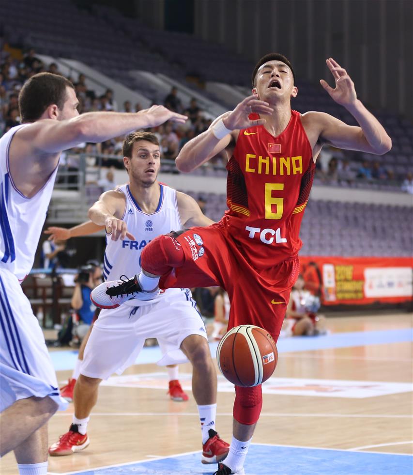 7月6日,中国队球员郭艾伦(右)在比赛中进攻受阻。 当日,在北京进行的2016斯坦科维奇杯篮球赛第二日比赛中,中国队负于法国队。新华社记者张晨摄
