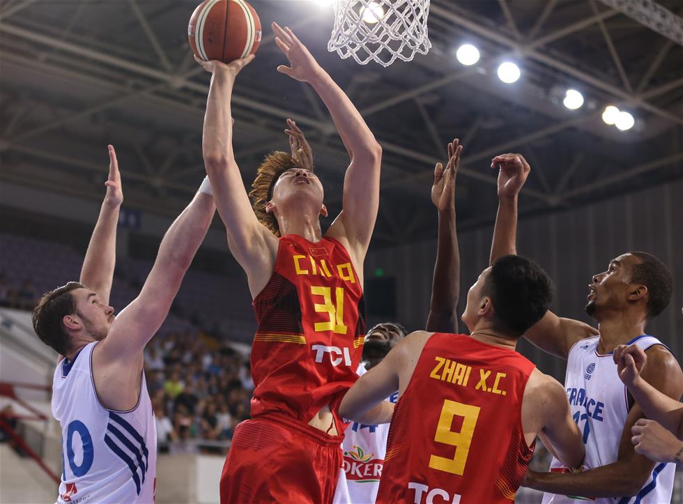 7月6日,中国队球员王哲林(左二)在比赛中上篮。 当日,在北京进行的2016斯坦科维奇杯篮球赛第二日比赛中,中国队负于法国队。新华社记者张晨摄
