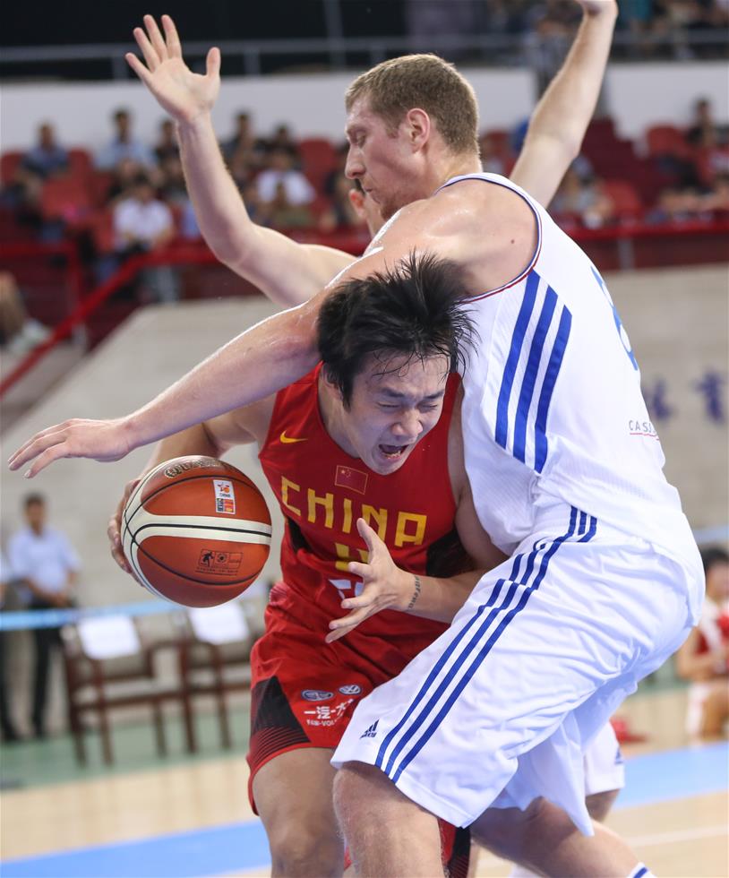 7月6日,中国队球员丁彦雨航(左)在比赛中突破。 当日,在北京进行的2016斯坦科维奇杯篮球赛第二日比赛中,中国队负于法国队。新华社记者张晨摄