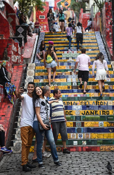 8月3日,游客在塞拉隆阶梯观光。里约奥运会开幕在即,连日来,游客也日益增加。据巴西官方数据,预计本届奥运会期间将有近50万外国游客来到里约。 新华社记者王昊飞摄