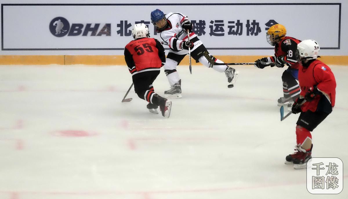 8月5日,2016“青少年冰球月”在首都体育馆举行开球仪式。图为参加比赛的运动员在激烈比赛中。千龙网发 崔峻摄