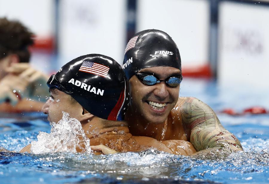 8月12日,美国选手安东尼·埃尔文(右)与队友倪家骏庆祝夺冠。当日,在2016年里约奥运会游泳男子50米自由泳决赛中,美国选手安东尼·埃尔文以21秒40的成绩夺得冠军。新华社记者丁旭摄