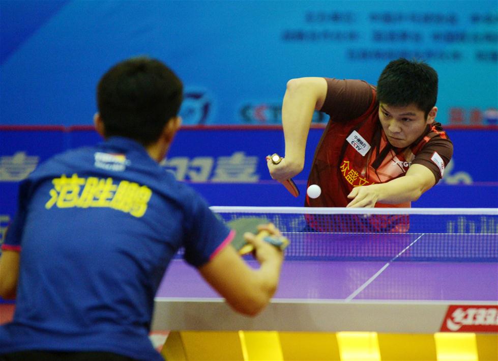 10月18日,八一大商队球员樊振东(右)在比赛中回球。樊振东以3比0战胜霸州海润队球员范胜鹏。当日,在2016中国乒乓球俱乐部超级联赛男子团体第一阶段第二轮比赛中,八一大商队客场以3比0战胜霸州海润队。 新华社记者王晓摄
