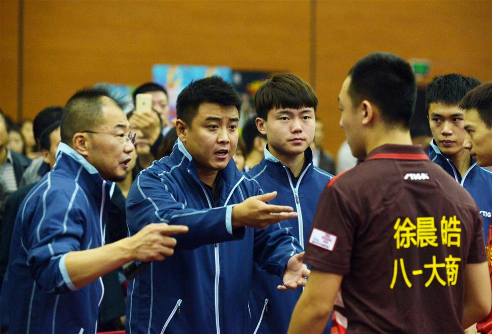 10月18日,八一大商队主教练王皓(左二)在比赛间隙指导球员。当日,在2016中国乒乓球俱乐部超级联赛男子团体第一阶段第二轮比赛中,八一大商队客场以3比0战胜霸州海润队。 新华社记者王晓摄