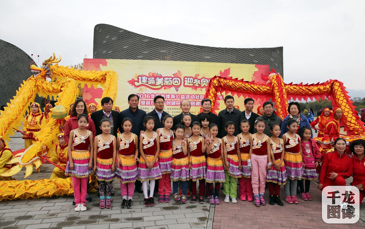 10月22日,“2016北京市体育公益活动社区行闭幕式暨延庆区‘创城杯’趣味运动会”在世界葡萄博览园内举行。图为与会嘉宾和演员合影。千龙网发 组委会供图