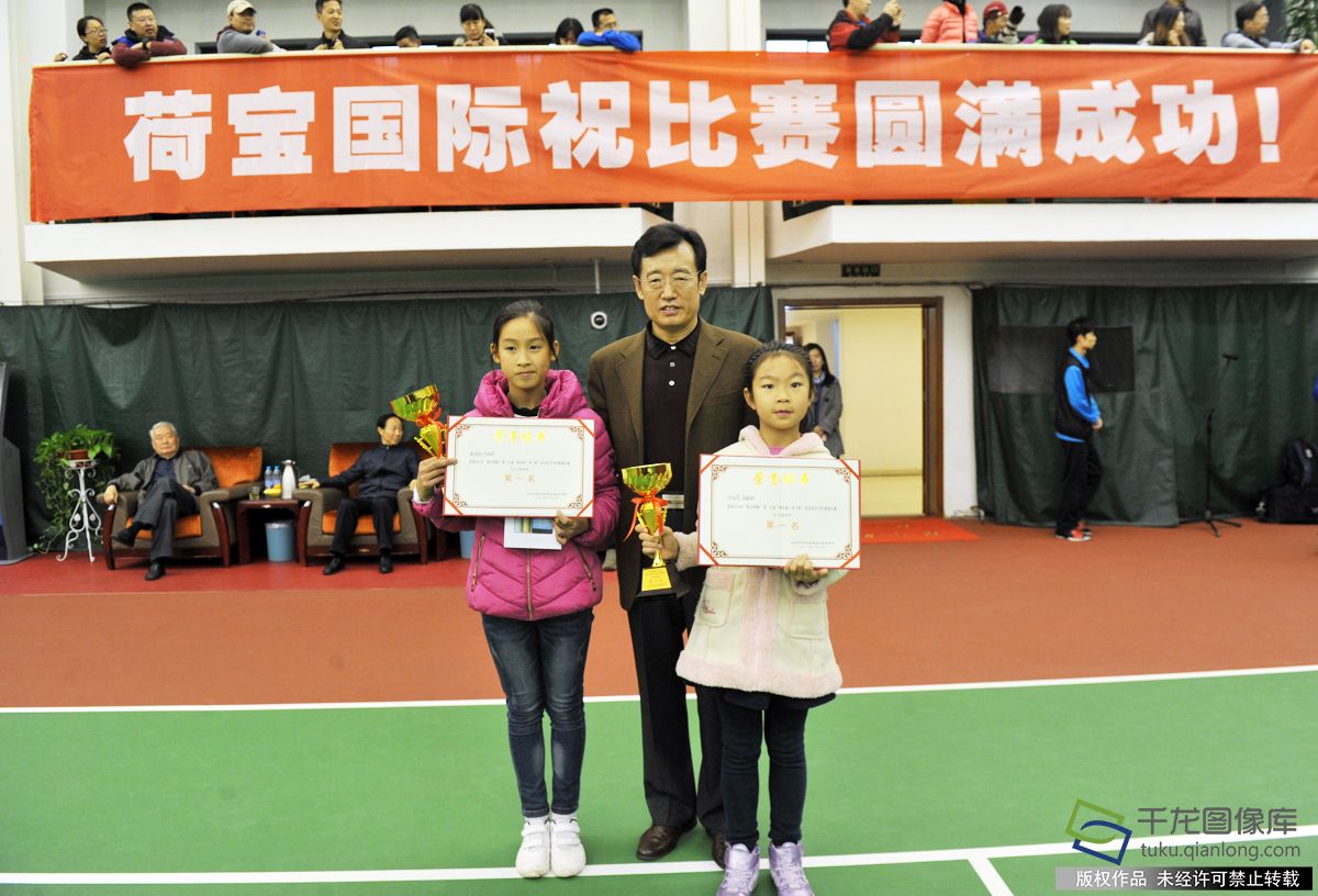 10月30日,第二十届“将军杯、木兰杯”青少年网球比赛在先农坛体育场网球馆落下帷幕。来自北京的90多名青少年网球选手参加了甲、乙两个组别的8个项目的比赛。图为北京市体育局局长孙学才为获奖选手颁奖并合影留念。千龙网记者 戚连民摄