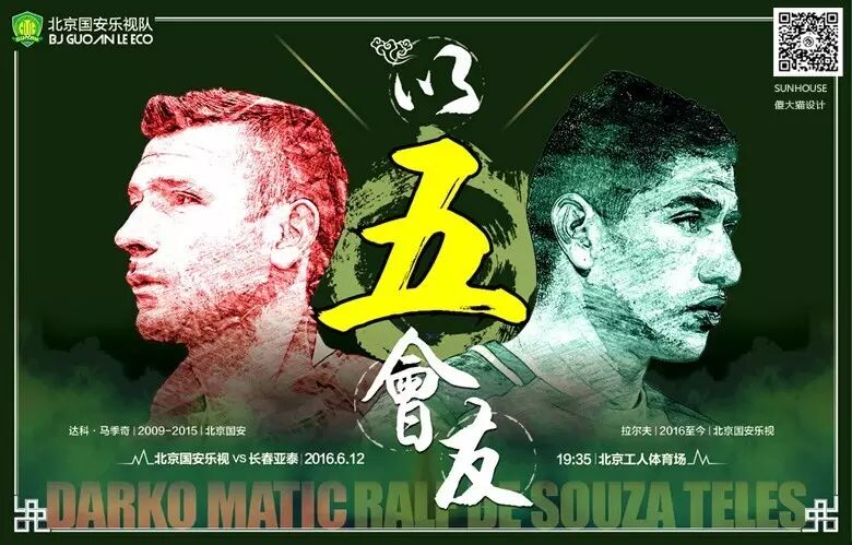 一直想设计一幅纯中式风格的海报,本轮国安前5号和现5号的碰面给了我这样的机会,也应了这个中式风格的文字主题。这是我特别喜欢的一个设计。