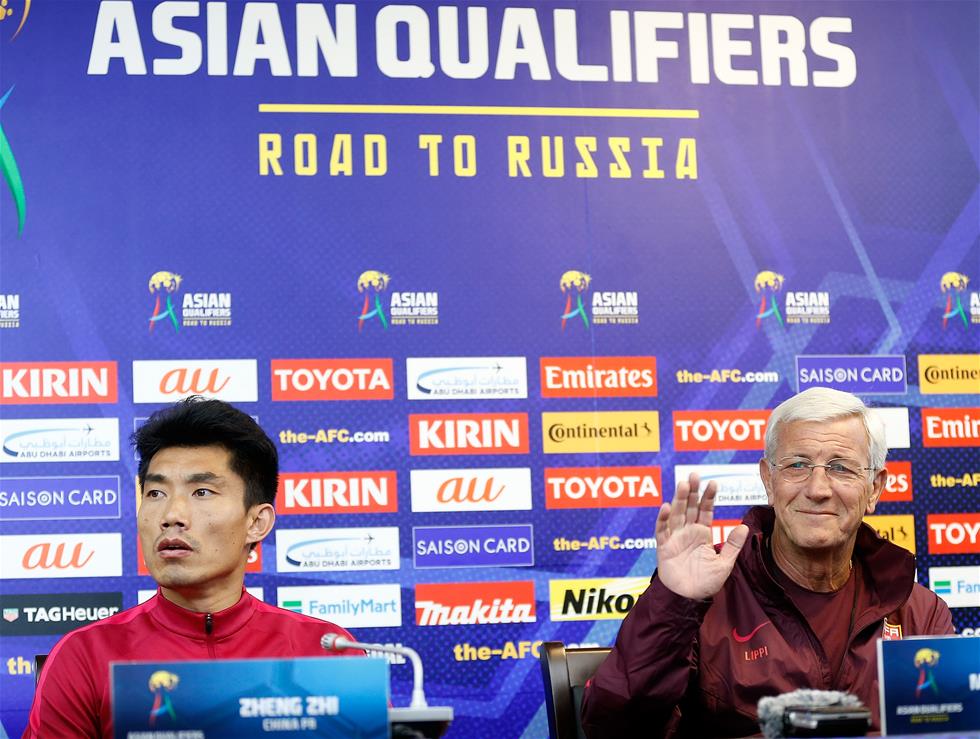 11月14日,国足主教练里皮(右)与国家队队长郑智在新闻发布会中。当日,中国男子足球队在昆明拓东体育场举行赛前新闻发布会。国足将在11月15日举行的2018年俄罗斯世界杯亚洲区预选赛12强赛中迎战卡塔尔队。新华社记者王丽莉摄