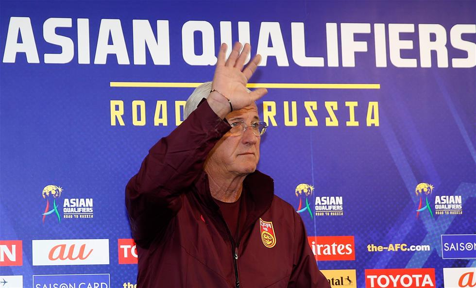 11月14日,国足主教练里皮抵达新闻发布会现场向记者挥手致意。当日,中国男子足球队在昆明拓东体育场举行赛前新闻发布会。国足将在11月15日举行的2018年俄罗斯世界杯亚洲区预选赛12强赛中迎战卡塔尔队。新华社记者王丽莉摄