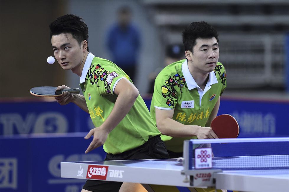 12月24日,深圳宝安明金海队组合崔庆磊/刘吉康(左)在比赛中。他们在双打比赛中以0比2不敌山东鲁能队组合张超/林晨。当日,在2016中国乒乓球俱乐部超级联赛男子团体第一阶段第18轮比赛中,山东鲁能队主场以3比0战胜深圳宝安明金海队。新华社记者郭绪雷摄