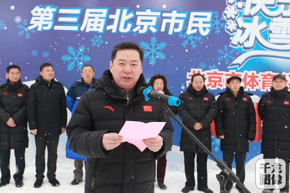 1月7日,2017北京市体育公益活动社区行启动仪式在延庆举行。图为北京市体育局副局长陈杰致辞。千龙网发 主办方供图