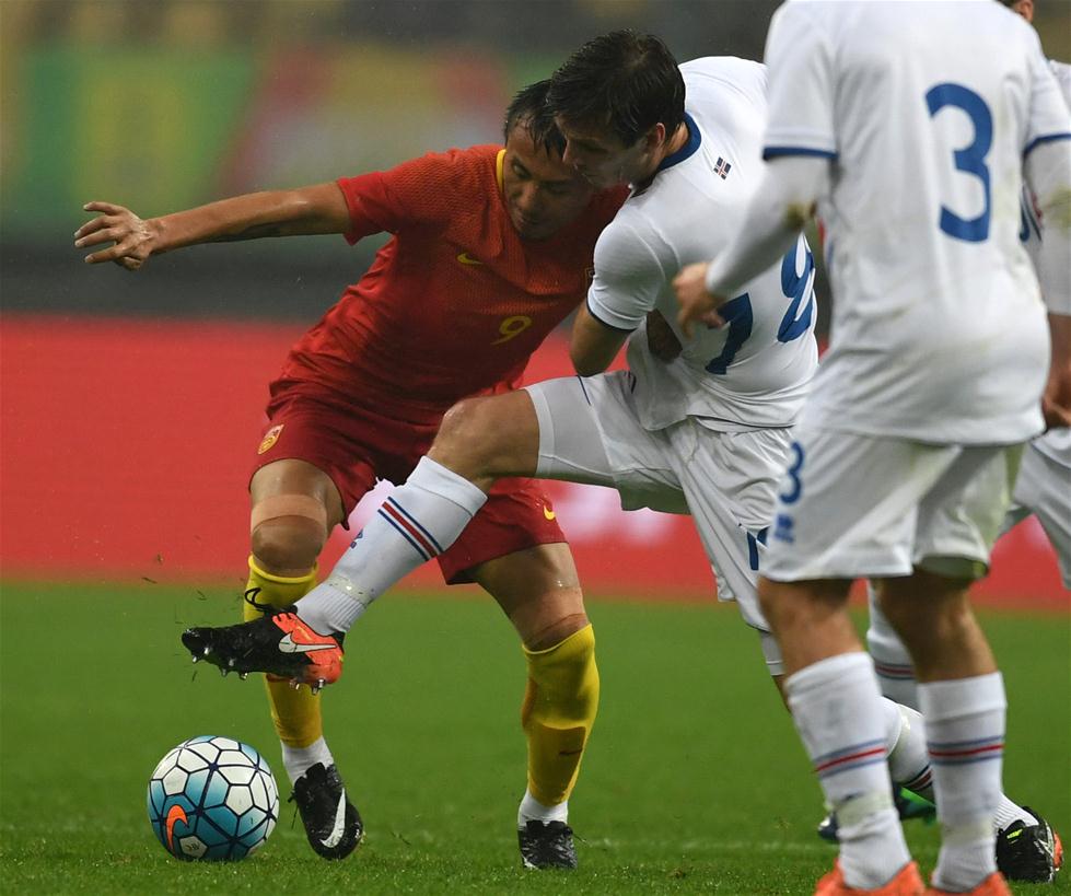 1月10日,中国队球员毛剑卿(左)与冰岛队球员比加尔纳松(中)拼抢。当日,在广西体育中心举行的2017中国杯国际足球锦标赛中,中国队0-2不敌冰岛队。 新华社记者郭勇摄