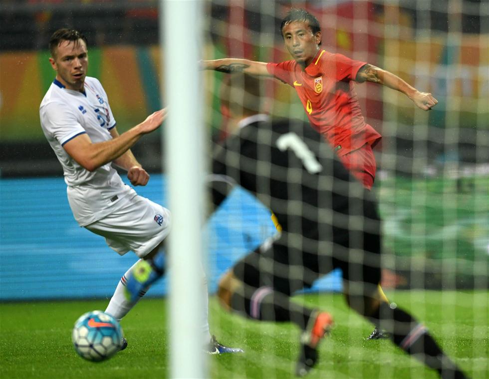 1月10日,中国队球员毛剑卿(右)在比赛中射门。 当日,在广西体育中心举行的2017中国杯国际足球锦标赛中,中国队0-2不敌冰岛队。新华社记者郭勇摄