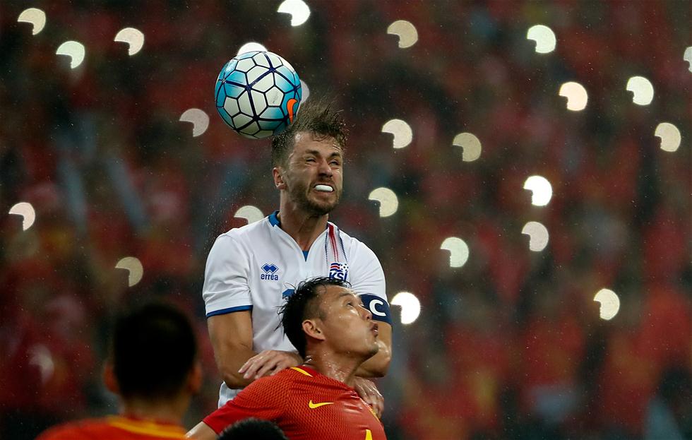 1月10日,冰岛队球员阿纳松(上)在比赛中争顶。 当日,在广西体育中心举行的2017中国杯国际足球锦标赛中,中国队0-2不敌冰岛队。新华社记者曹灿摄