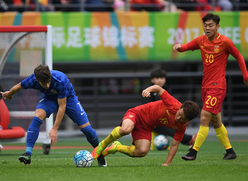 1月14日,中国队球员池忠国(前右)在比赛中拼抢。当日,在广西体育中心举行的2017中国杯国际足球锦标赛季军争夺战中,中国队在90分钟内以1比1战平克罗地亚队,经过点球大战最终以5比4的总比分战胜对手,获得季军。新华社记者周华摄
