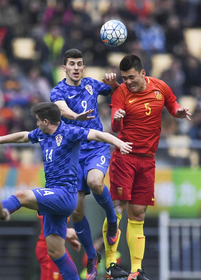 1月14日,中国队球员杨善平(右)与克罗地亚队球员米尔科·马利奇(中)在比赛中争抢头球。当日,在广西体育中心举行的2017中国杯国际足球锦标赛季军争夺战中,中国队在90分钟内以1比1战平克罗地亚队,经过点球大战最终以5比4的总比分战胜对手,获得季军。新华社记者周华摄