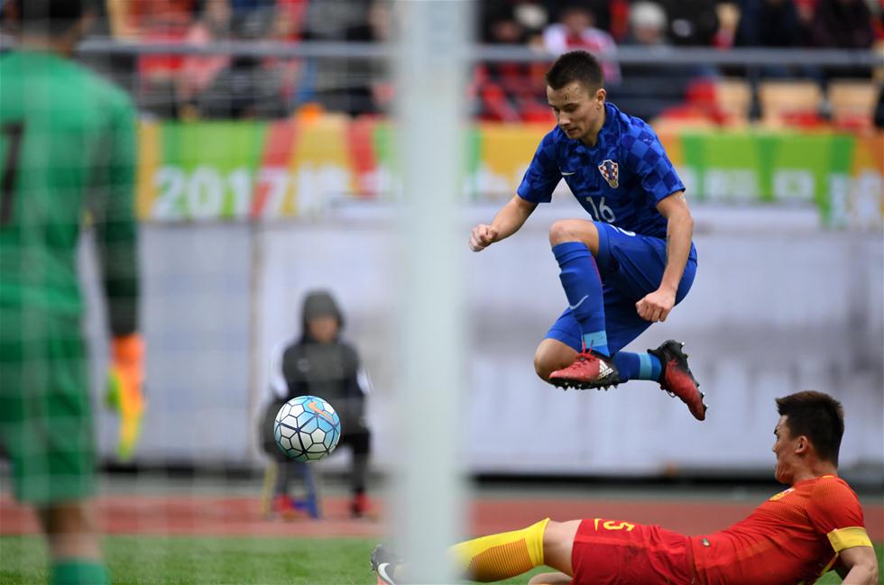 1月14日,中国队球员杨善平(下)在比赛中铲球。当日,在广西体育中心举行的2017中国杯国际足球锦标赛季军争夺战中,中国队在90分钟内以1比1战平克罗地亚队,经过点球大战最终以5比4的总比分战胜对手,获得季军。新华社记者周华摄