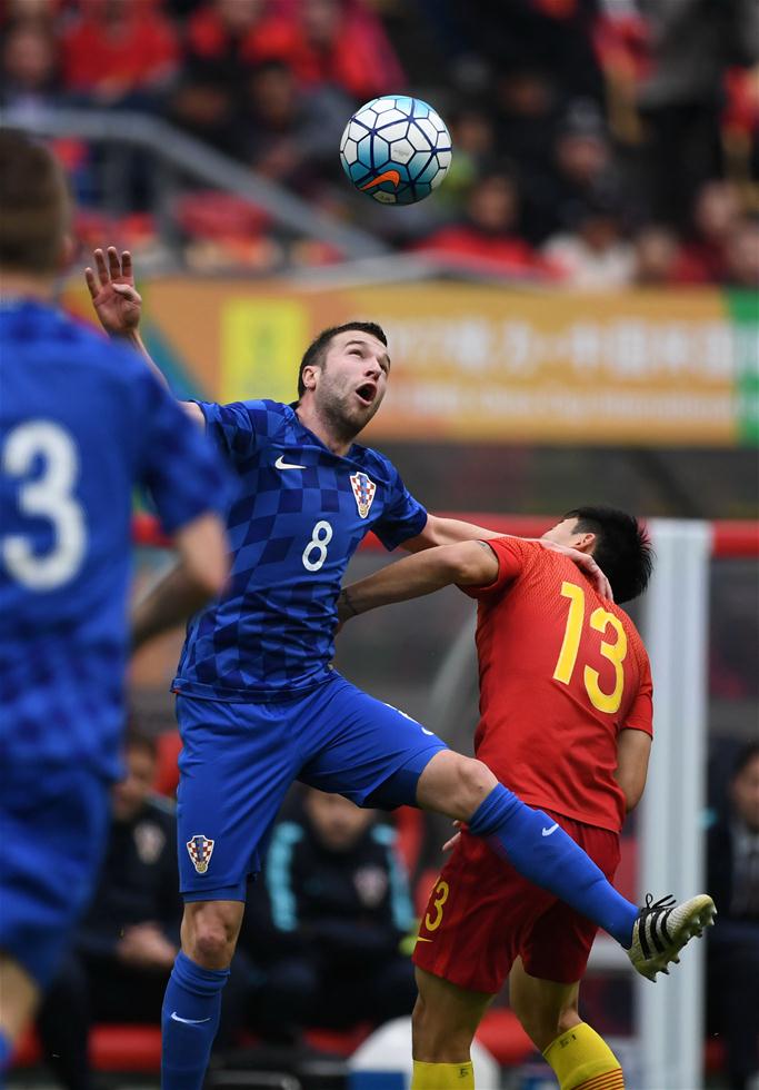 1月14日,克罗地亚队球员多马戈伊·安托利奇(中)与中国队球员邓涵文(右)在比赛中争抢头球。当日,在广西体育中心举行的2017中国杯国际足球锦标赛季军争夺战中,中国队在90分钟内以1比1战平克罗地亚队,经过点球大战最终以5比4的总比分战胜对手,获得季军。新华社记者周华摄