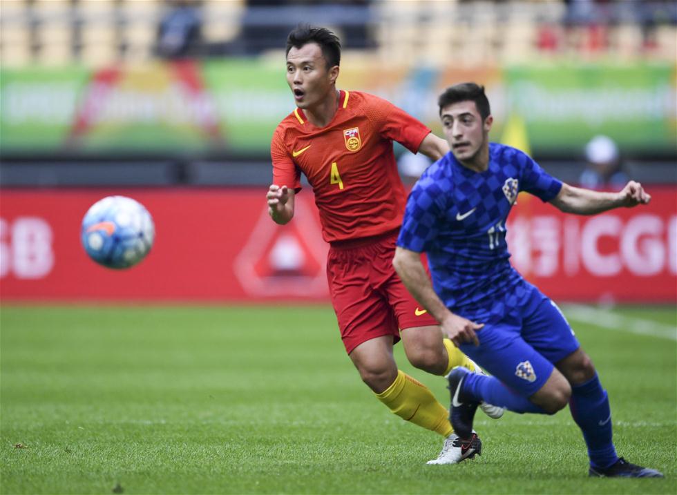 1月14日,中国队球员范晓冬(左)在比赛中拼抢。当日,在广西体育中心举行的2017中国杯国际足球锦标赛季军争夺战中,中国队在90分钟内以1比1战平克罗地亚队,经过点球大战最终以5比4的总比分战胜对手,获得季军。新华社记者周华摄