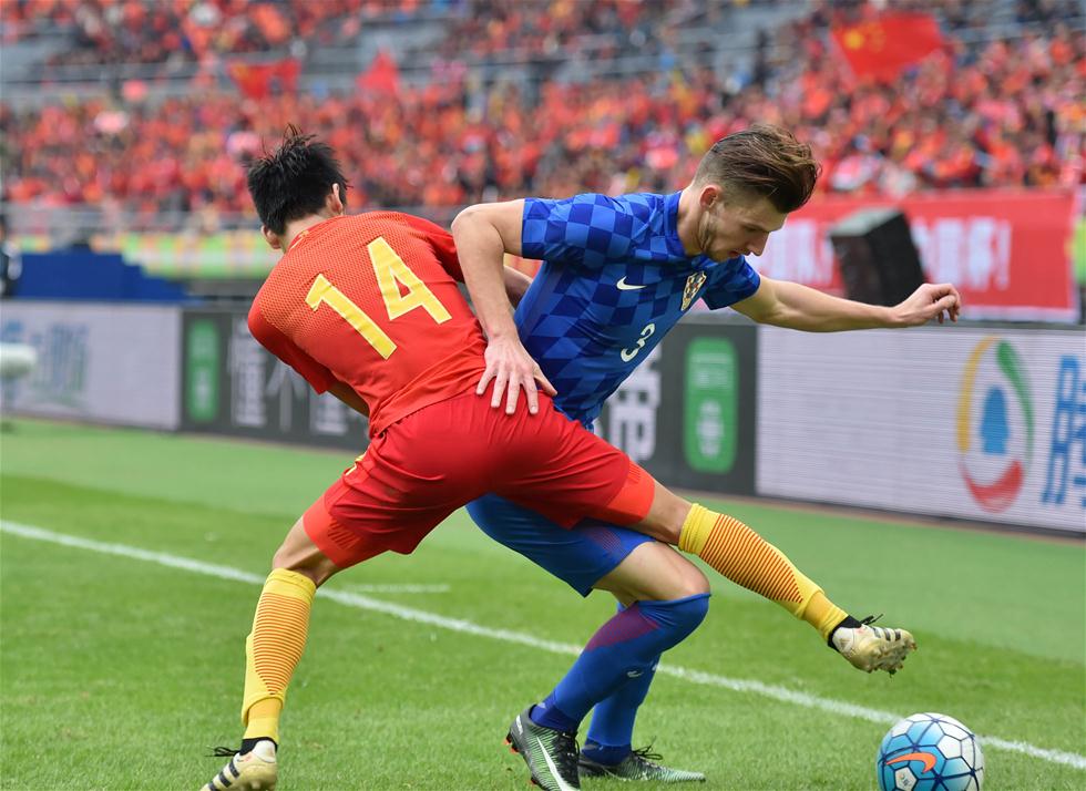 1月14日,中国队球员冯刚(左)在比赛中拼抢。当日,在广西体育中心举行的2017中国杯国际足球锦标赛季军争夺战中,中国队在90分钟内以1比1战平克罗地亚队,经过点球大战最终以5比4的总比分战胜对手,获得季军。新华社记者周华摄
