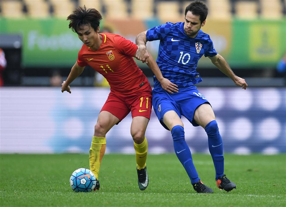 1月14日,中国队球员尹鸿博(左)与克罗地亚队球员安德里亚舍维奇在比赛中拼抢。当日,在广西体育中心举行的2017中国杯国际足球锦标赛季军争夺战中,中国队在90分钟内以1比1战平克罗地亚队,经过点球大战最终以5比4的总比分战胜对手,获得季军。新华社记者周华摄