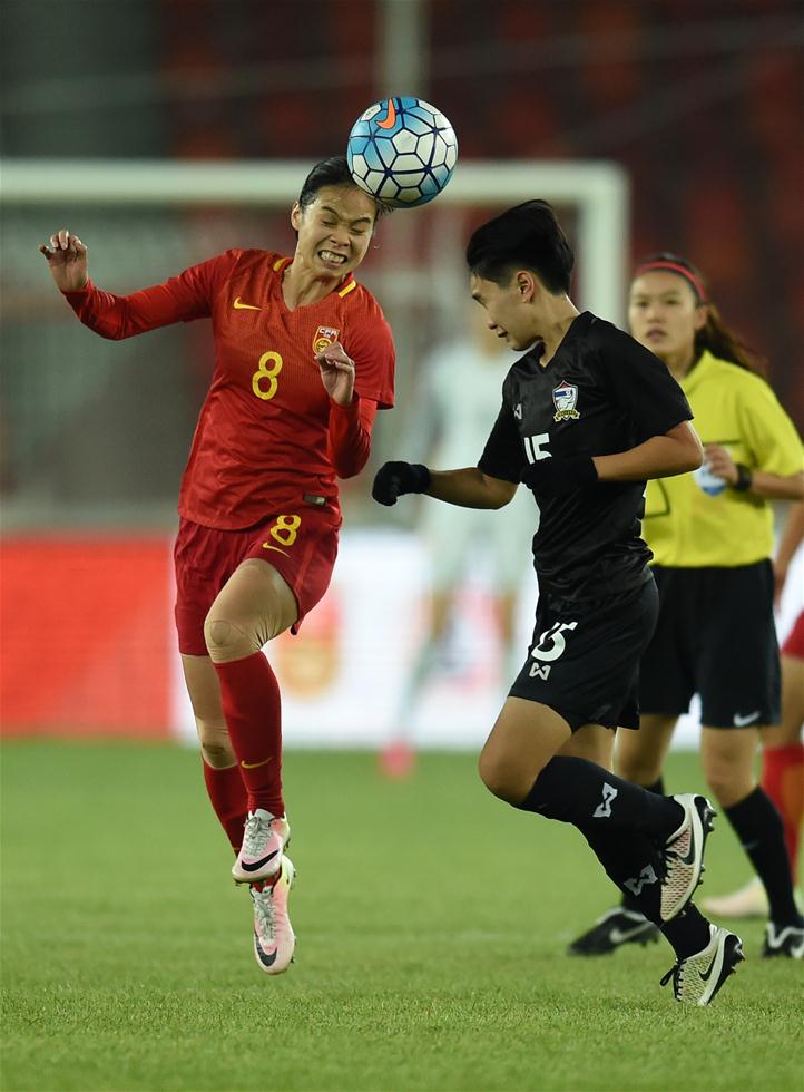 1月19日,中国队球员谭茹殷(左)在比赛中争顶。当日,在2017年“春辉物流杯”中国足协佛山国际女足锦标赛中,中国队以2比0战胜泰国队。 新华社记者贾宇辰摄