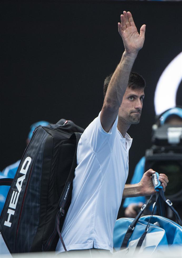 1月19日,塞尔维亚选手焦科维奇在比赛后向观众致意。当日,在澳大利亚网球公开赛男单第二轮比赛中,塞尔维亚选手焦科维奇以2比3不敌乌兹别克斯坦选手伊斯托明,无缘下一轮。 新华社记者吕小炜摄