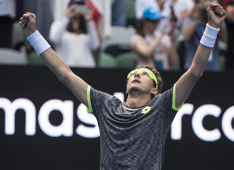 1月19日,乌兹别克斯坦选手伊斯托明庆祝胜利。当日,在澳大利亚网球公开赛男单第二轮比赛中,乌兹别克斯坦选手伊斯托明以3比2战胜塞尔维亚选手焦科维奇,晋级下一轮。 新华社记者吕小炜摄