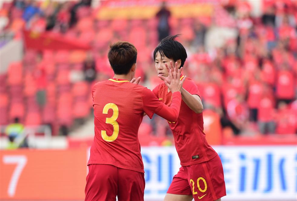 1月21日,中国女足球员张睿(右)进球后与队友马英双庆祝。当日,在2017年“春辉物流杯”中国足协佛山国际女足锦标赛中,中国队以2比0战胜缅甸队。 新华社记者刘大伟摄