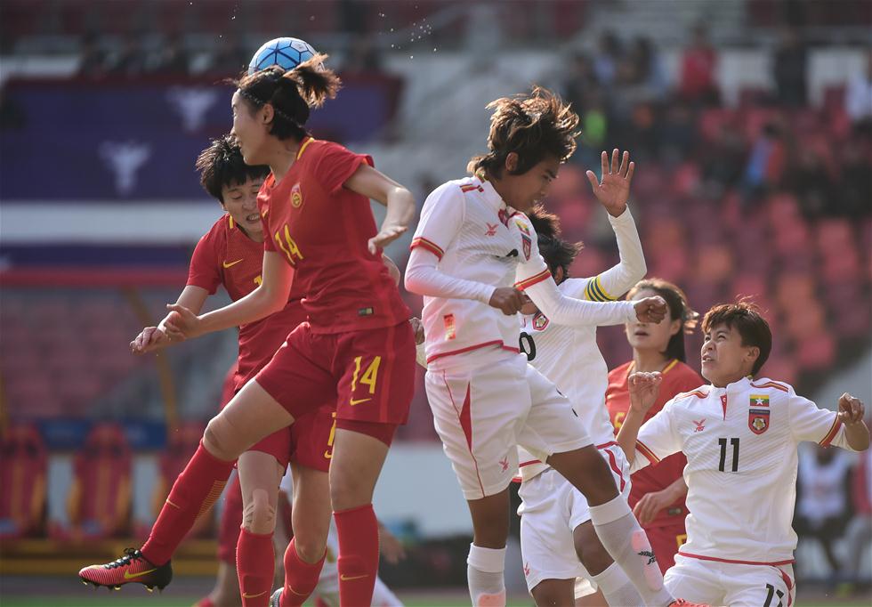 1月21日,中国队球员赵容(左二)在对方门前争顶。当日,在2017年“春辉物流杯”中国足协佛山国际女足锦标赛中,中国队以2比0战胜缅甸队。 新华社记者刘大伟摄