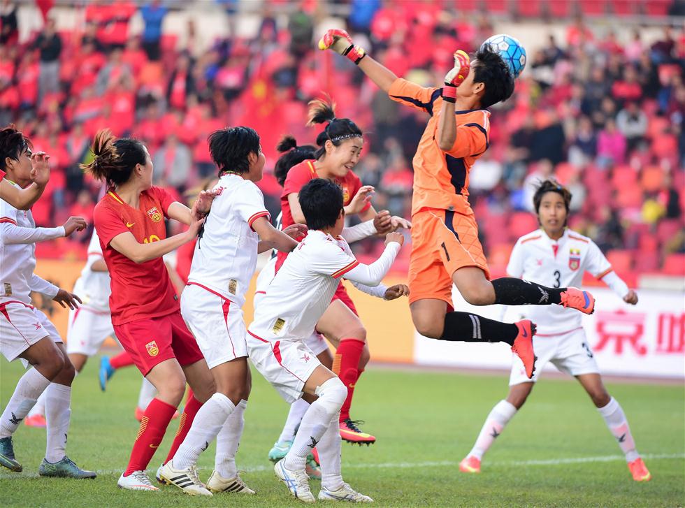 1月21日,缅甸队守门员玛普恩(右二)在比赛中出击。当日,在2017年“春辉物流杯”中国足协佛山国际女足锦标赛中,中国队以2比0战胜缅甸队。 新华社记者刘大伟摄
