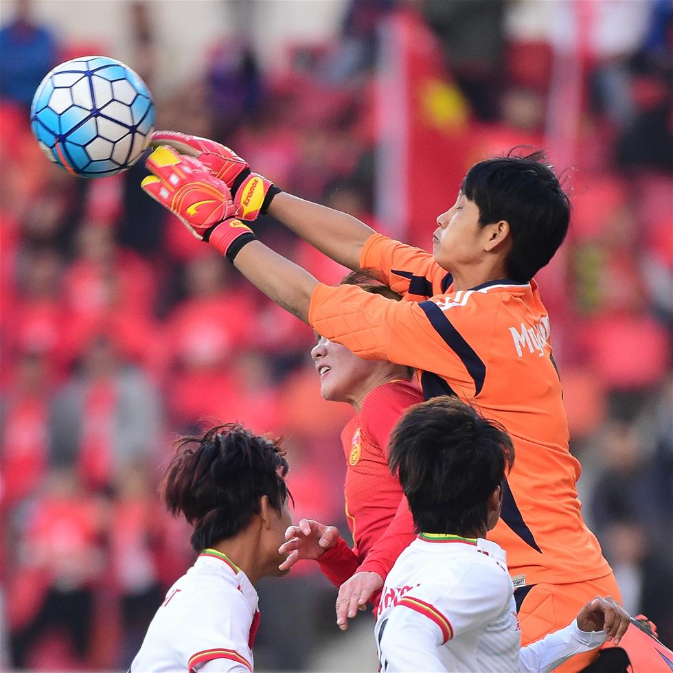 1月21日,缅甸队守门员玛普恩(上)在比赛中出击。当日,在2017年“春辉物流杯”中国足协佛山国际女足锦标赛中,中国队以2比0战胜缅甸队。 新华社记者刘大伟摄